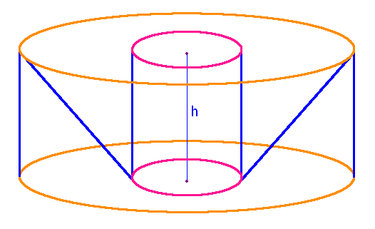 A- Un cylindre droit C1 dont la base a la même aire A1 que la sphère S1 (disque 1) et dont la hauteur est égale à h (la différence entre les rayons des deux sphères : h = R - r).